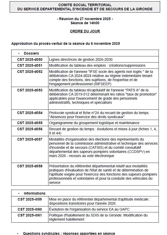 Nous, représentants du personnel – CFDT, CGT, FA, SNSPP-PATS FO, SUD, UNSA – demandons au SDIS de la Gironde :